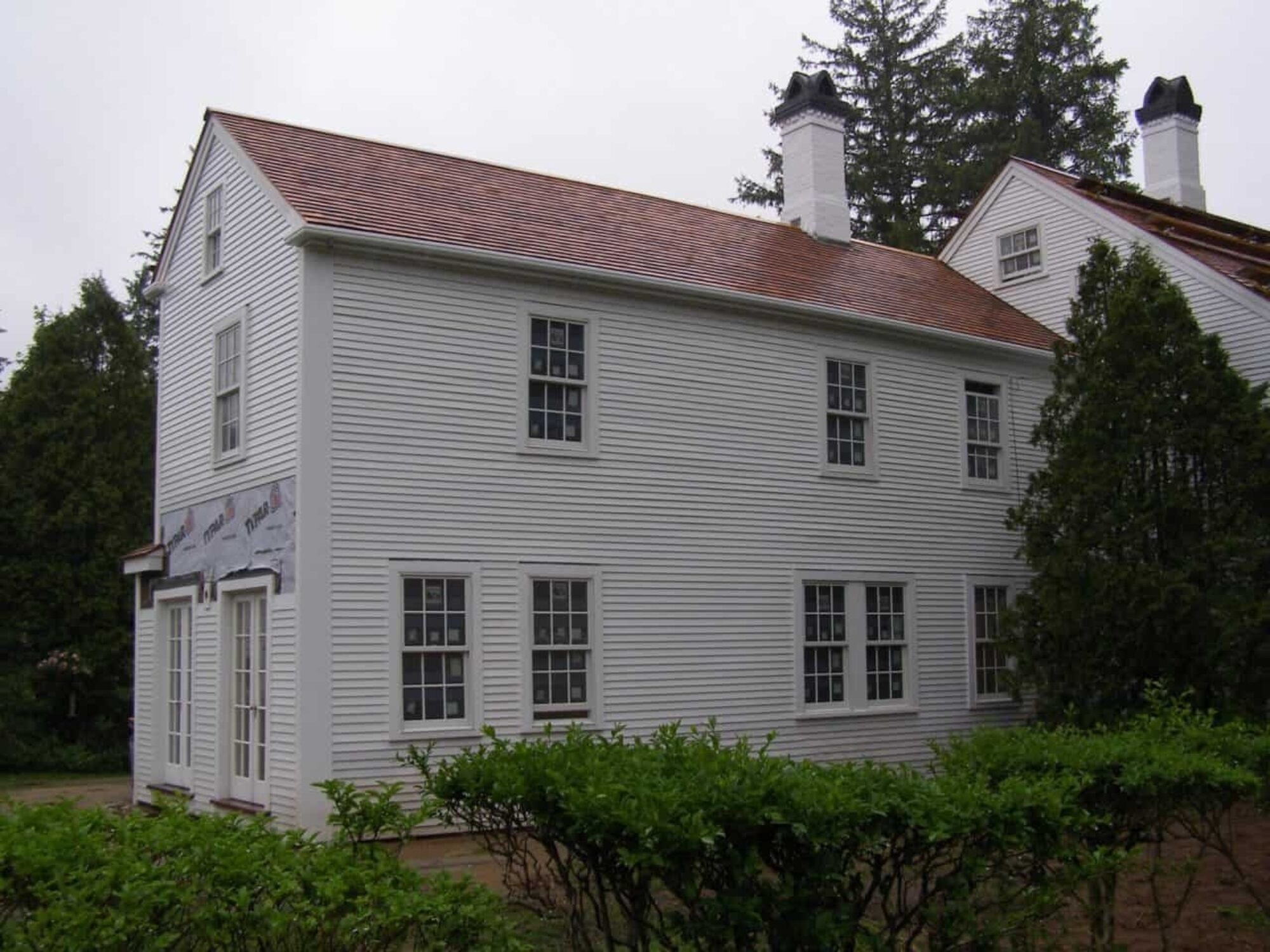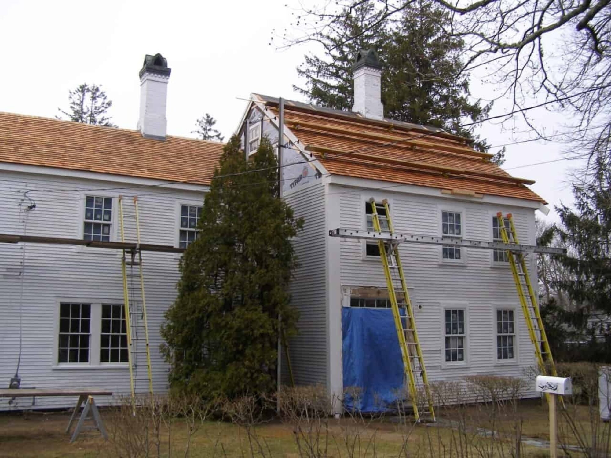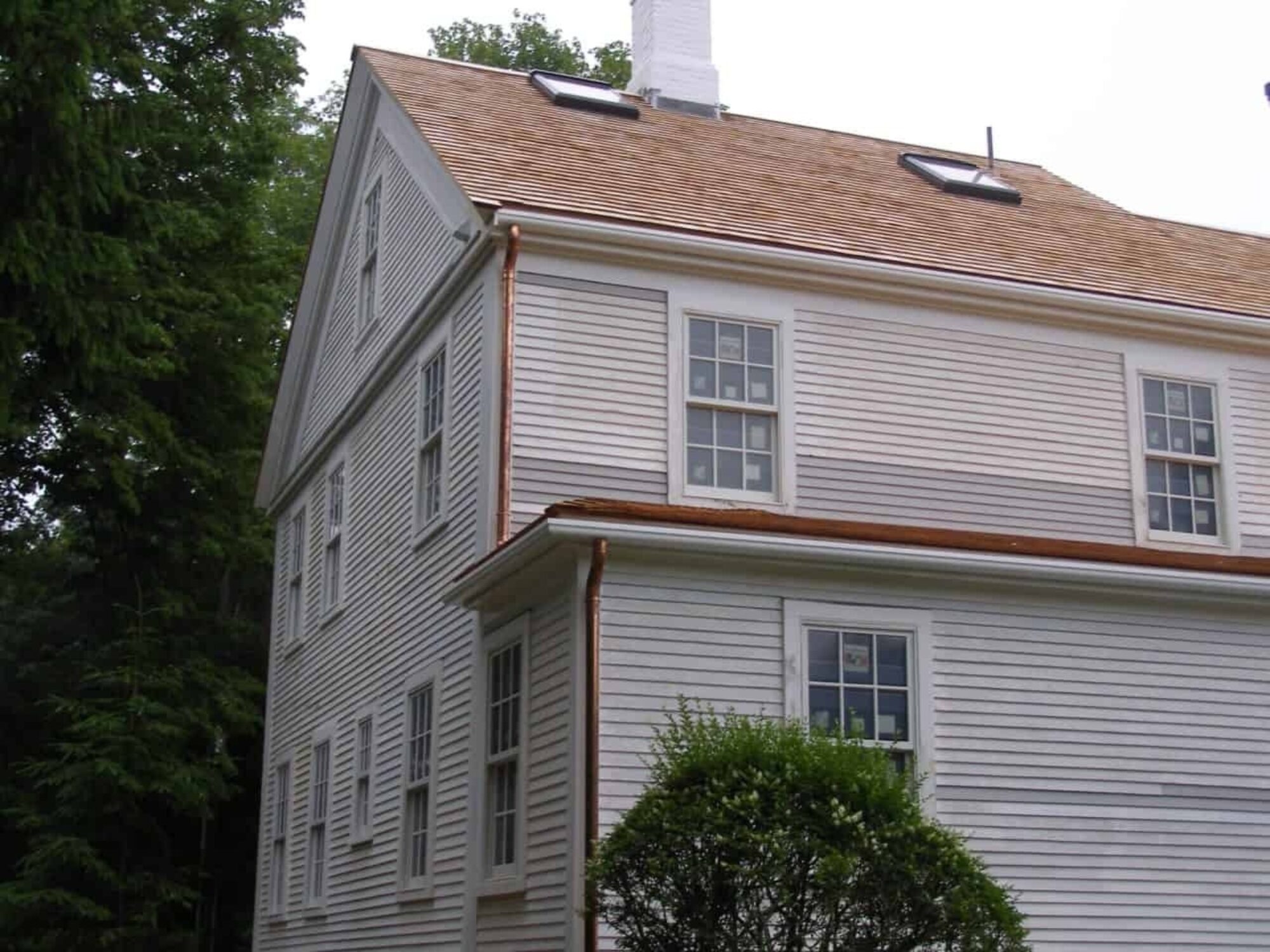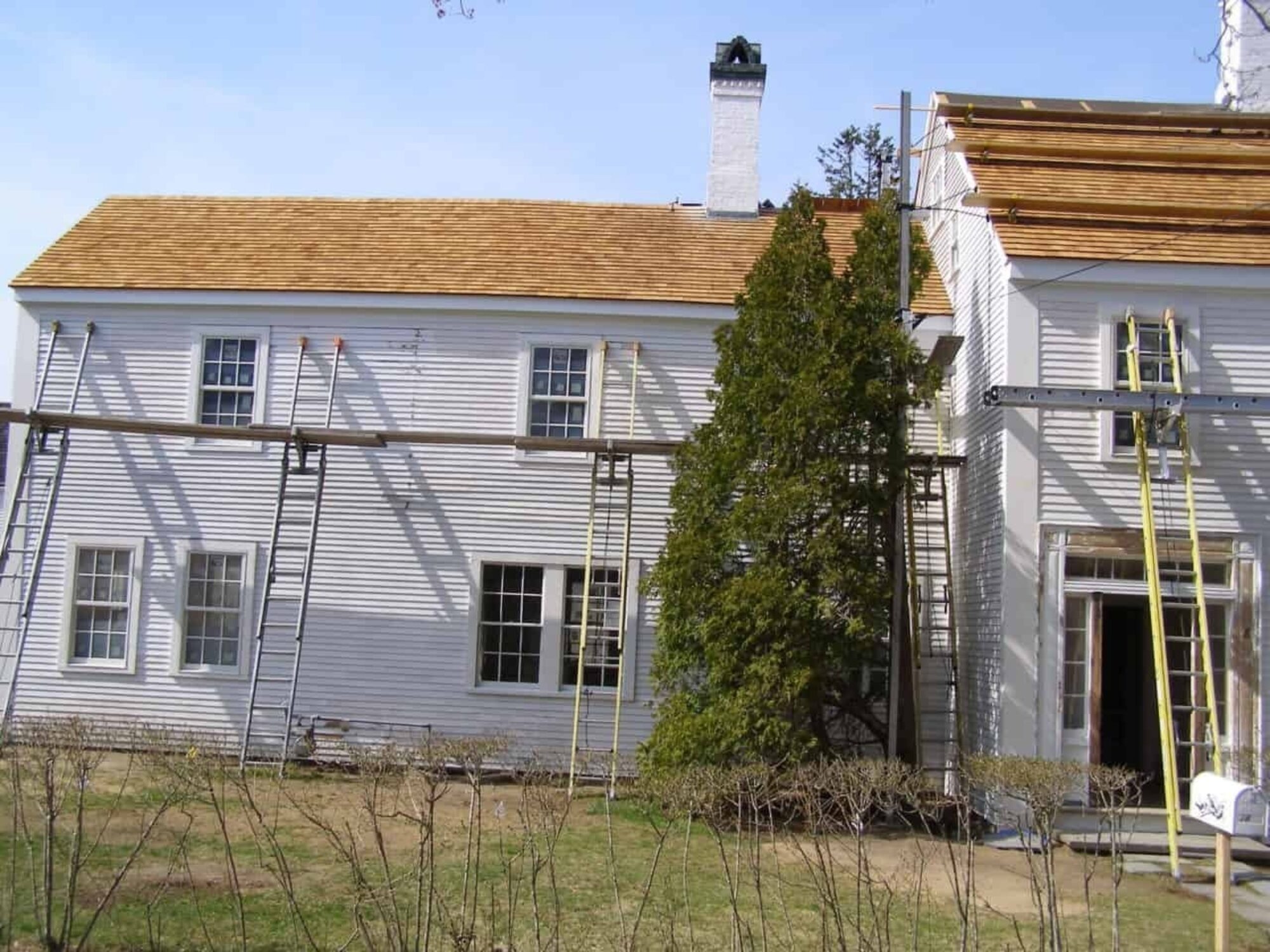 We framed a hip roof where the flat roof was on the rear bump out. We put a new cedar roof on the house replacing the old and deteriorated asphalt roofing. We replaced all of the rotted trim boards and repaired any bad clapboards and added gutters around the entire house.