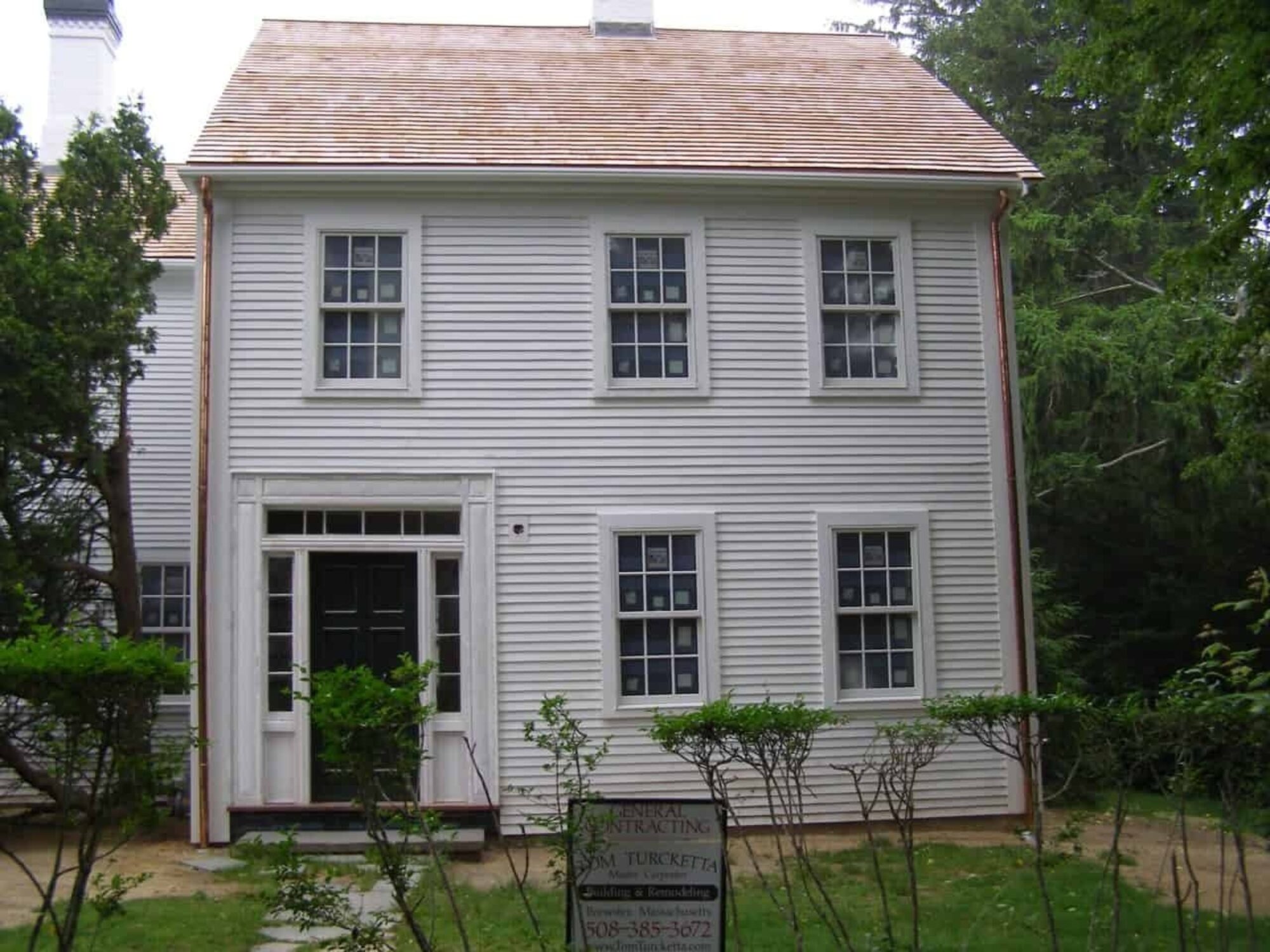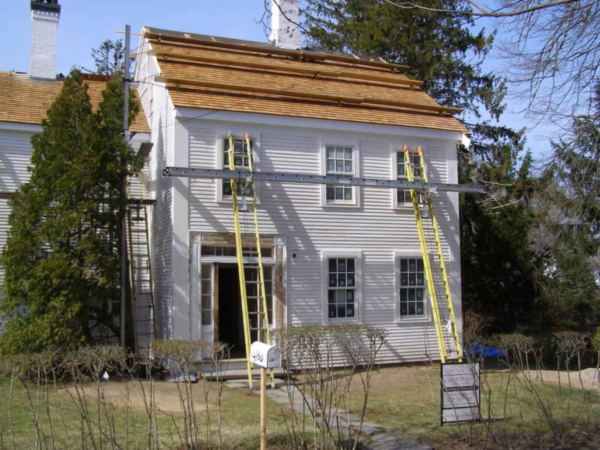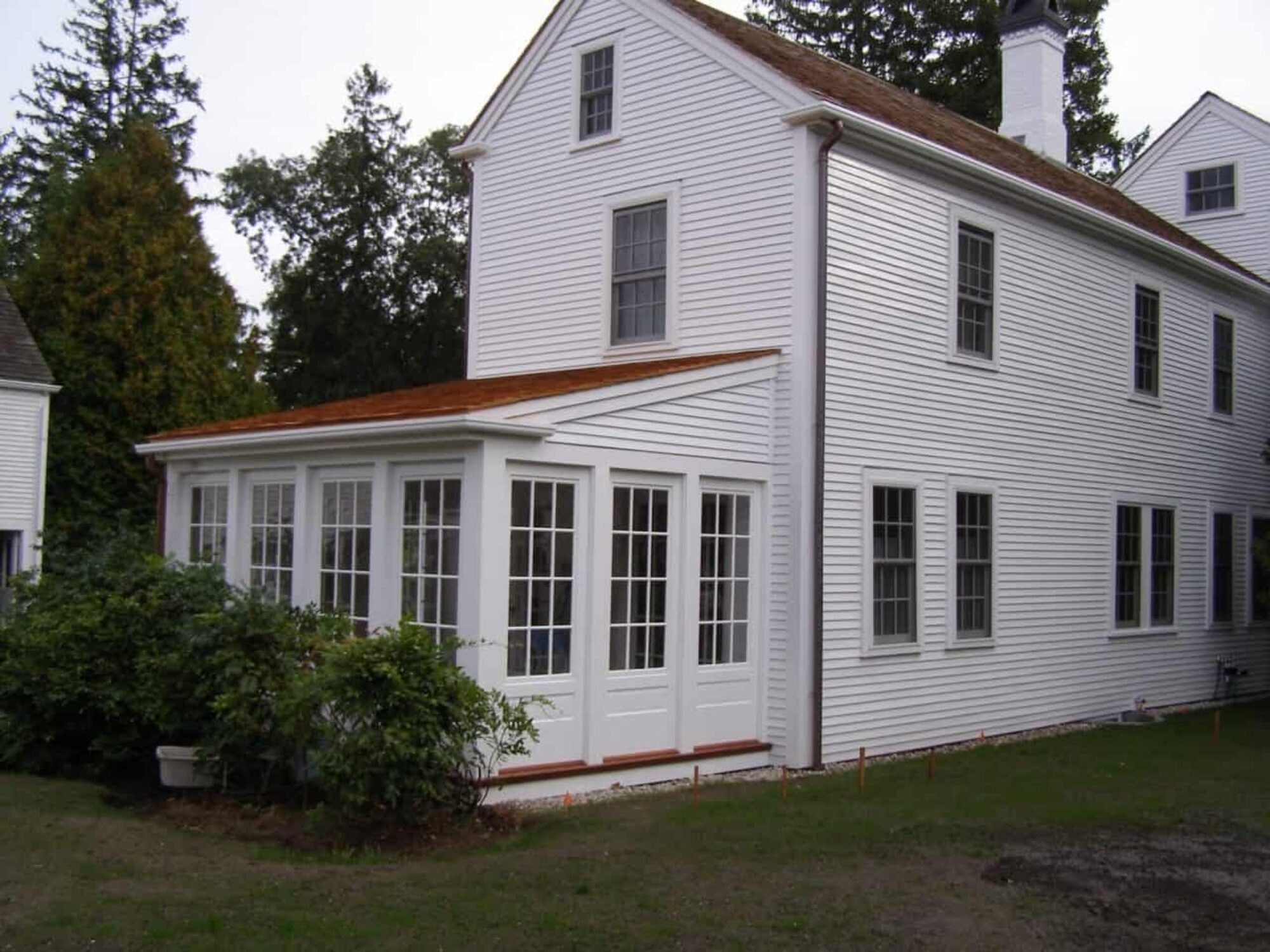 We framed a hip roof where the flat roof was on the rear bump out. We put a new cedar roof on the house replacing the old and deteriorated asphalt roofing. We replaced all of the rotted trim boards and repaired any bad clapboards and added gutters around the entire house.