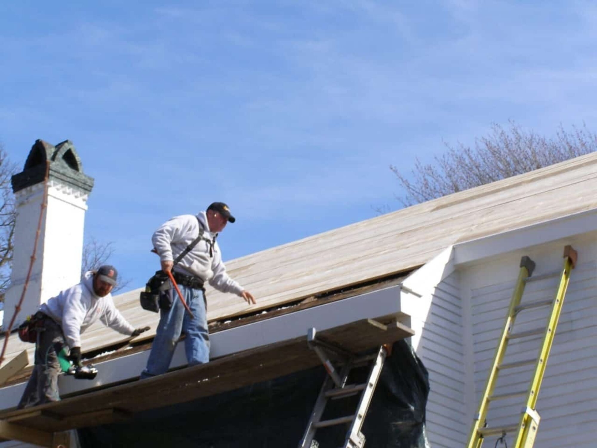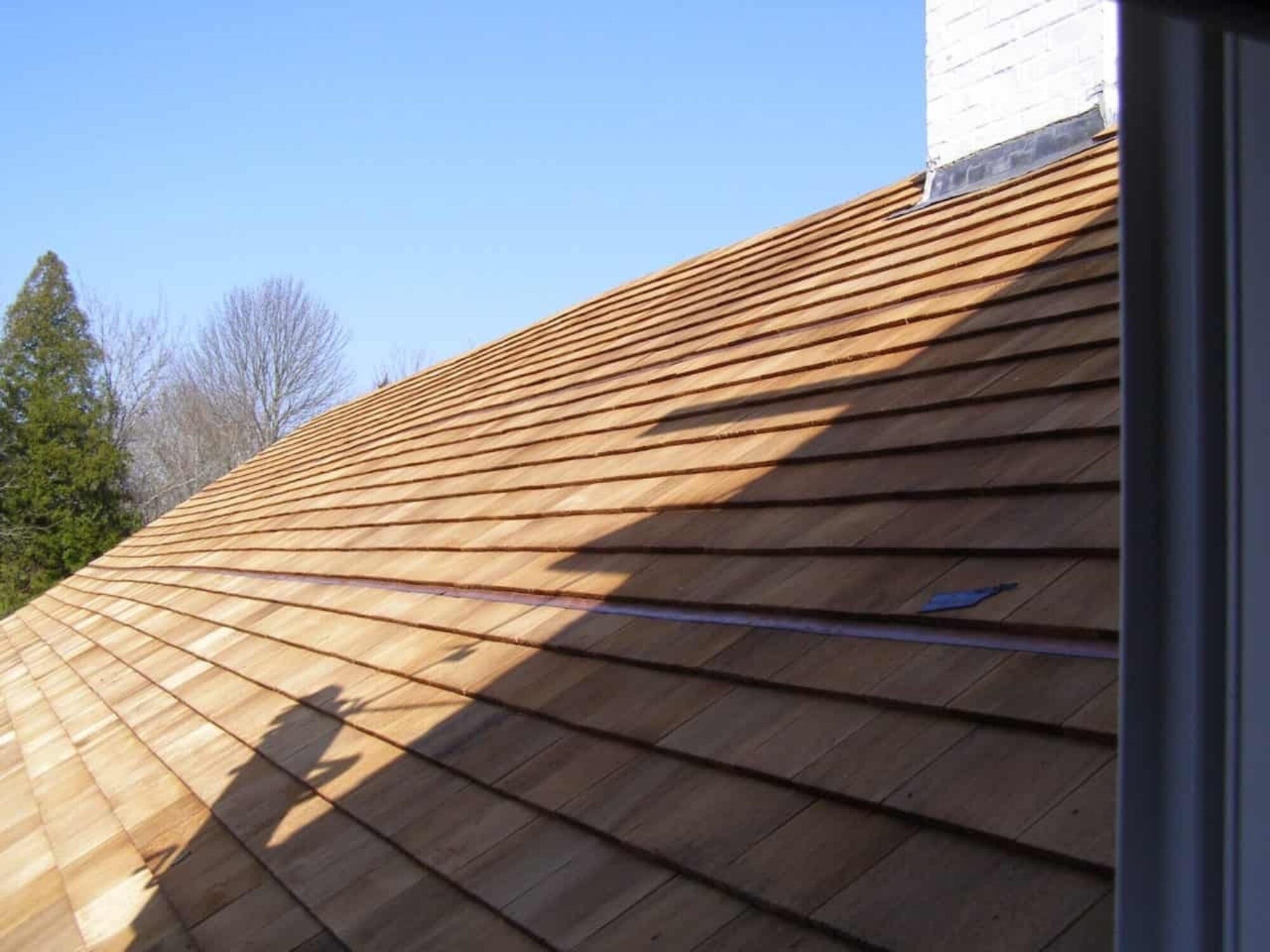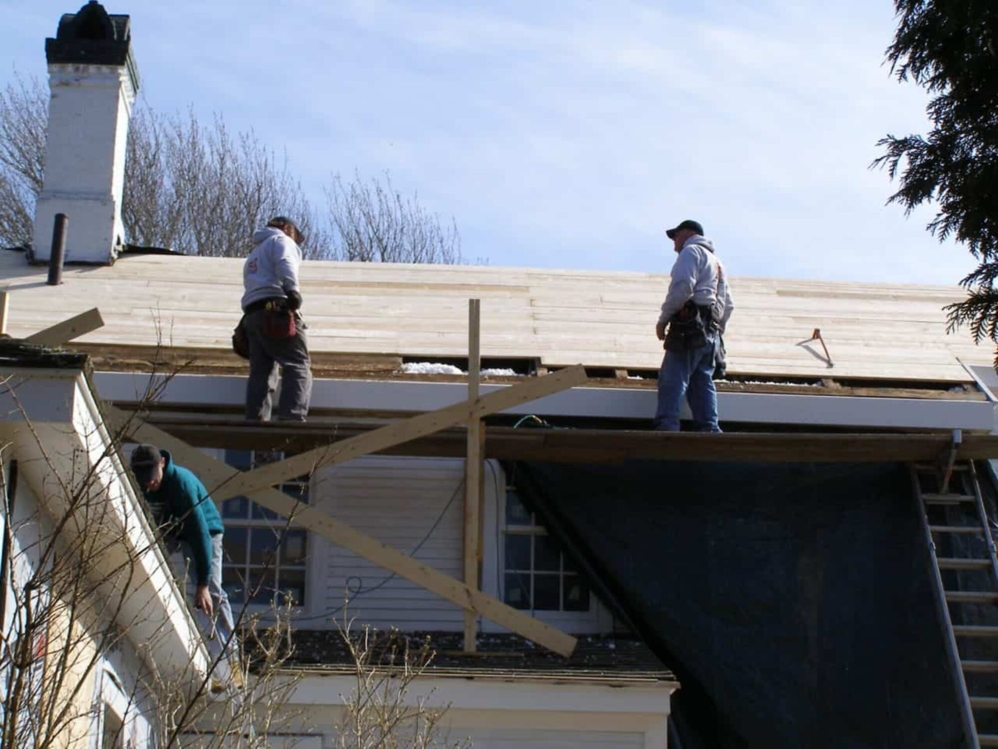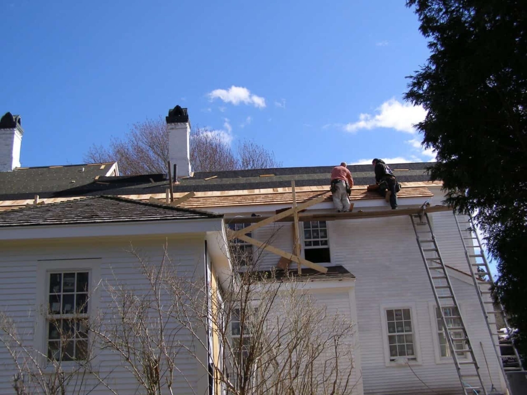 We framed a hip roof where the flat roof was on the rear bump out. We put a new cedar roof on the house replacing the old and deteriorated asphalt roofing. We replaced all of the rotted trim boards and repaired any bad clapboards and added gutters around the entire house.
