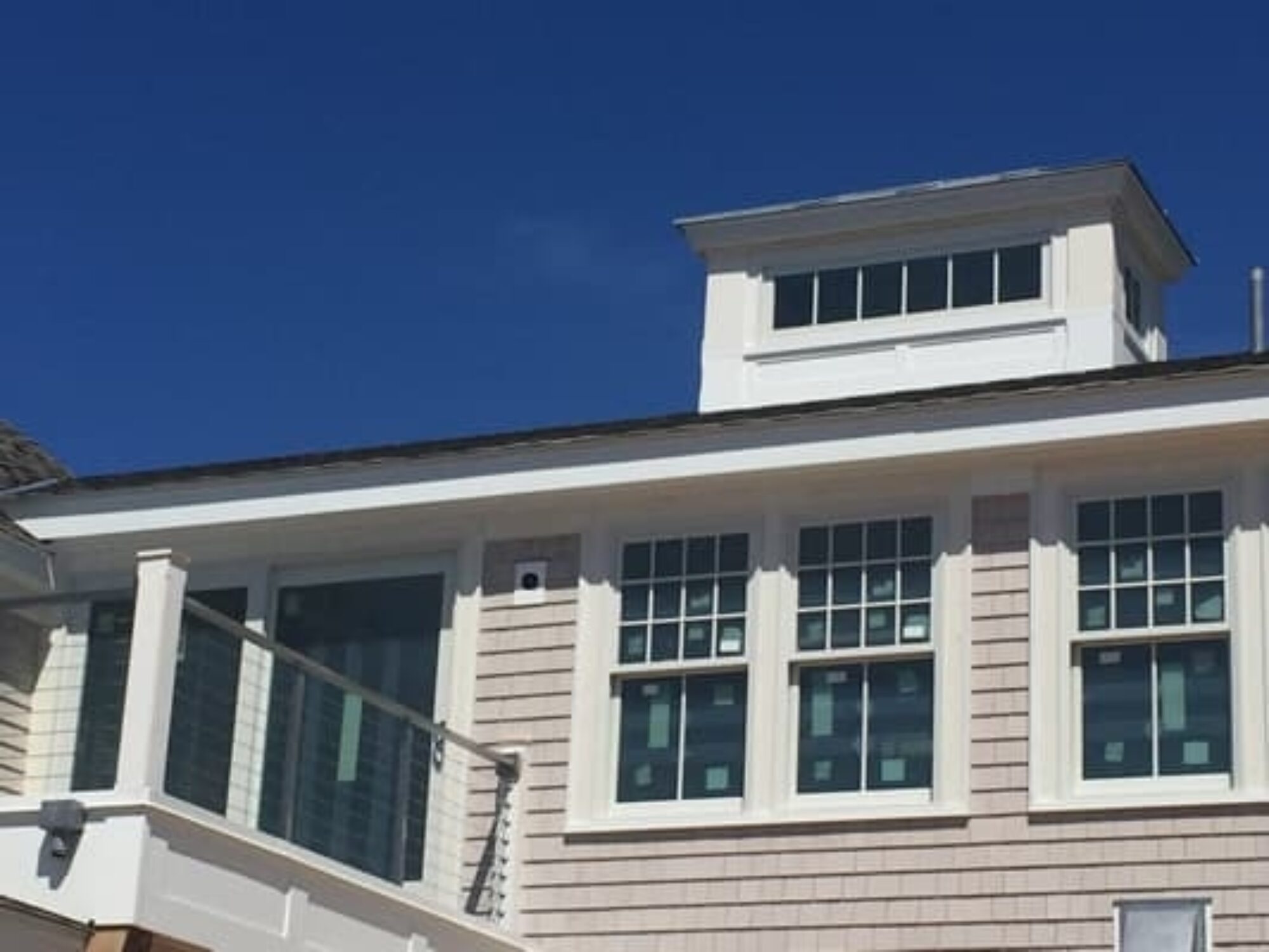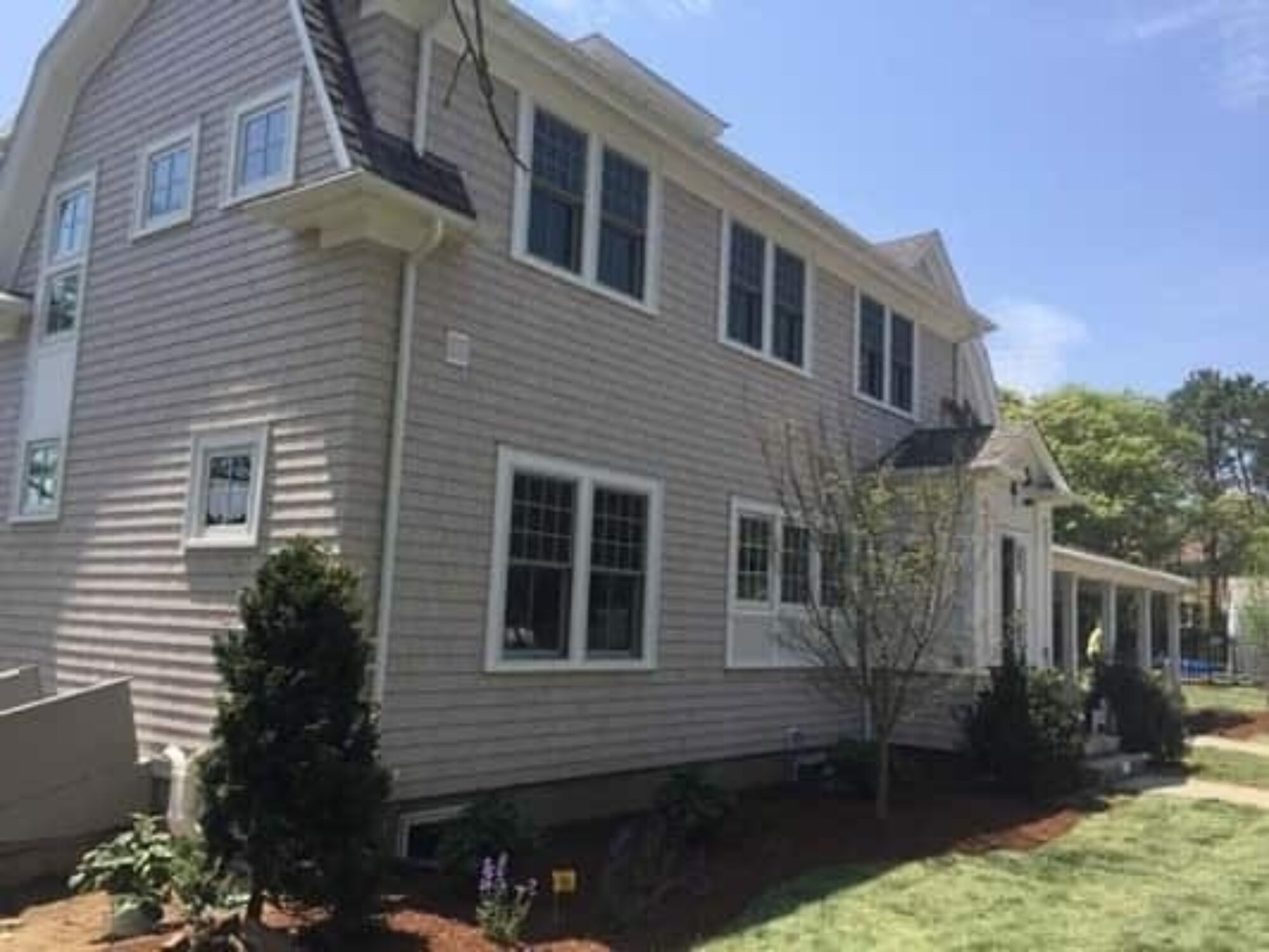 All the windows have been replaced with Andersen window units. The house has had all the wood shingles replaced with pre-stained shingles and has a new roof. All the exterior trim has been replaced. The overhanging gable trim has been added as a redesign. My opinion was that this feature would add to the style of the house.