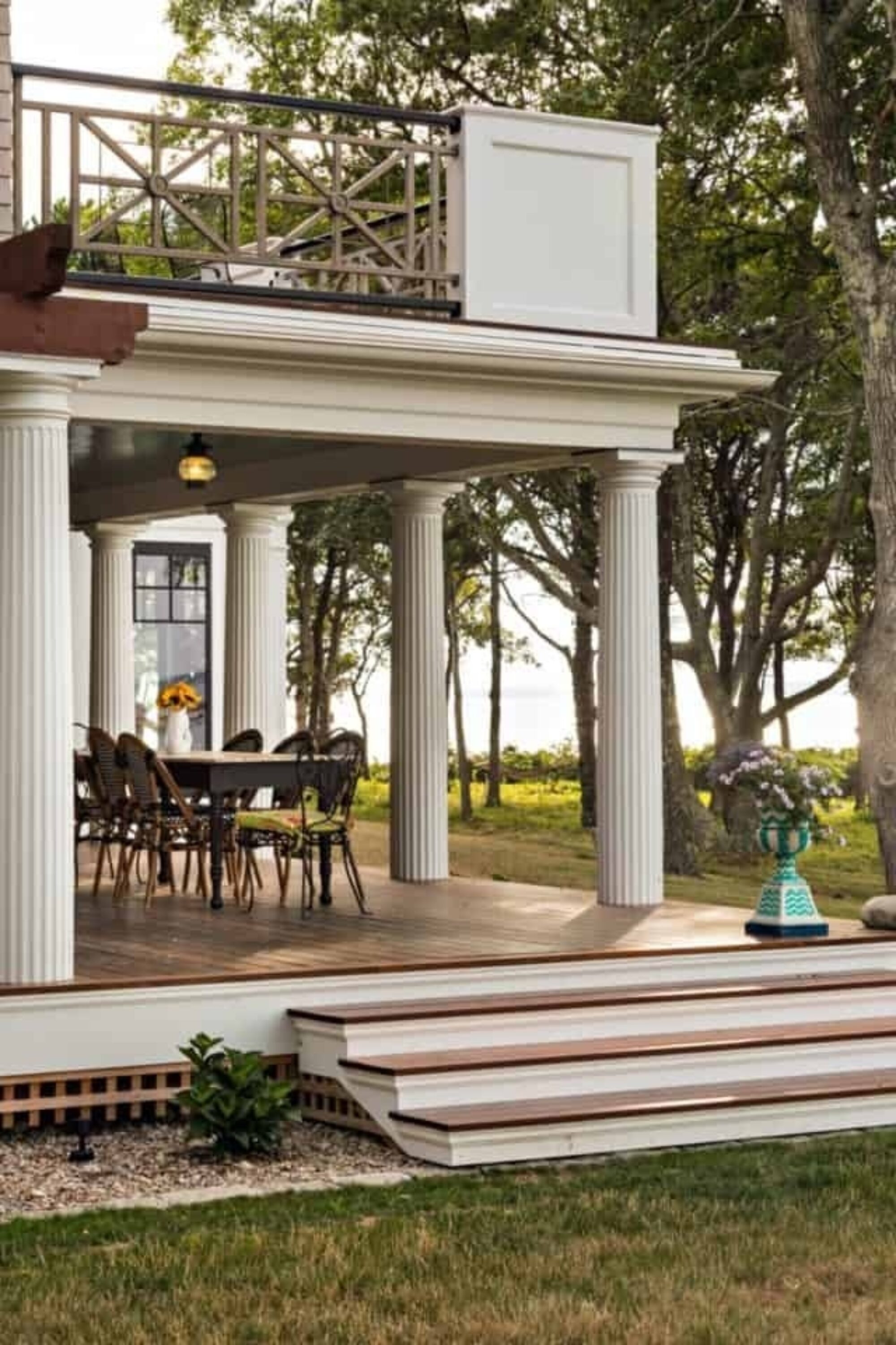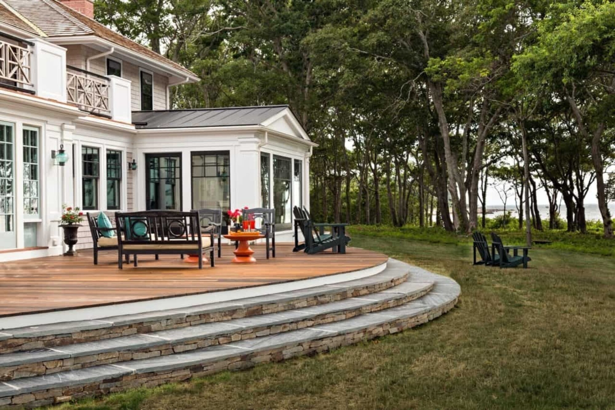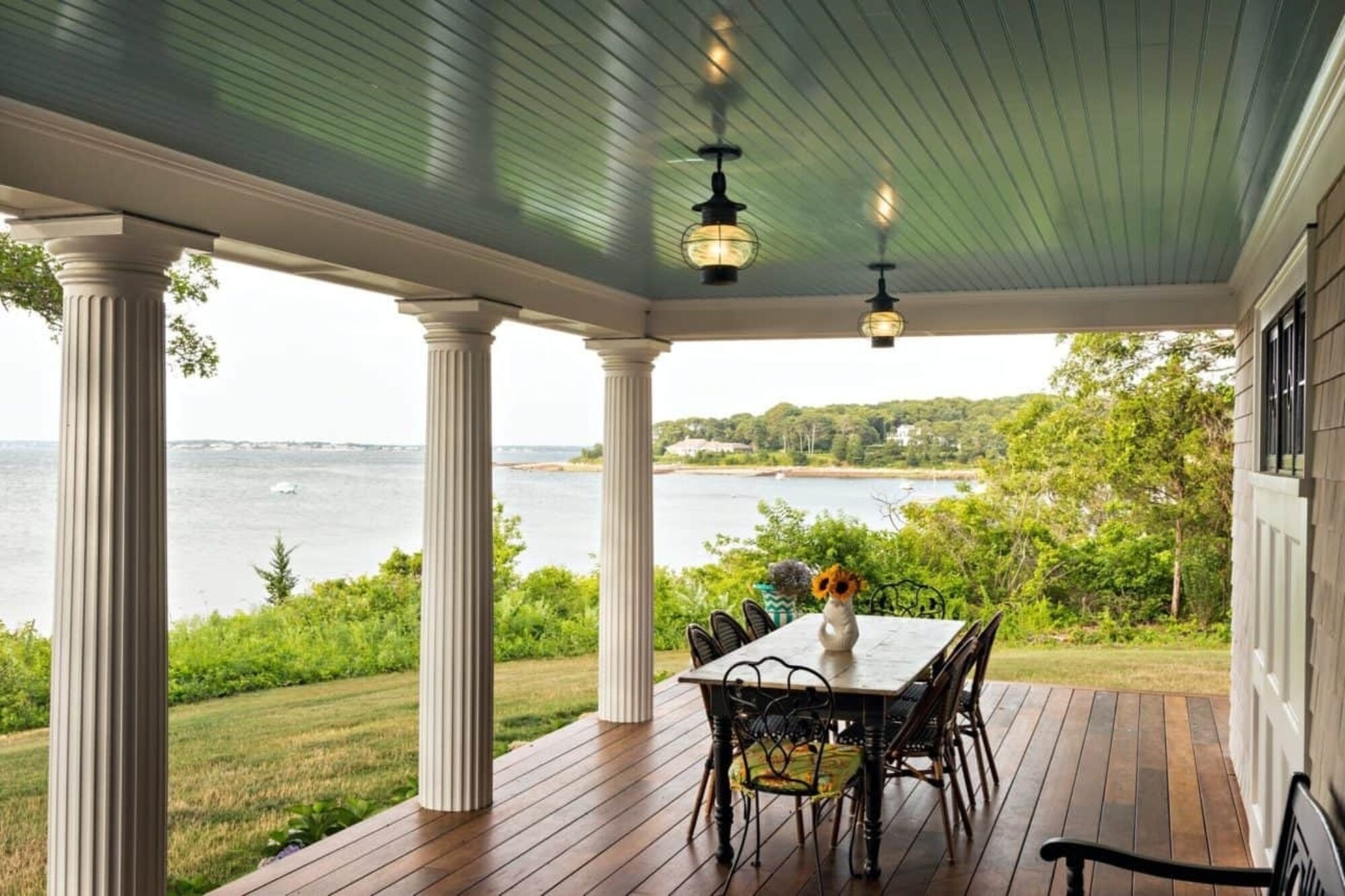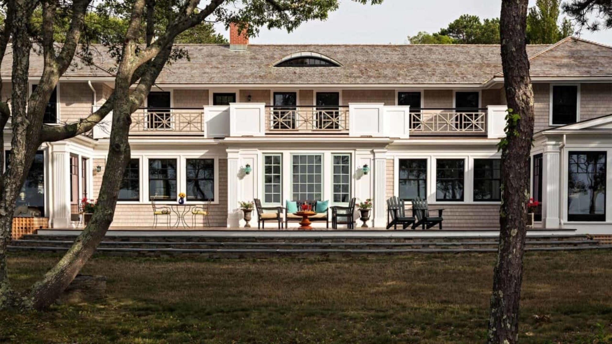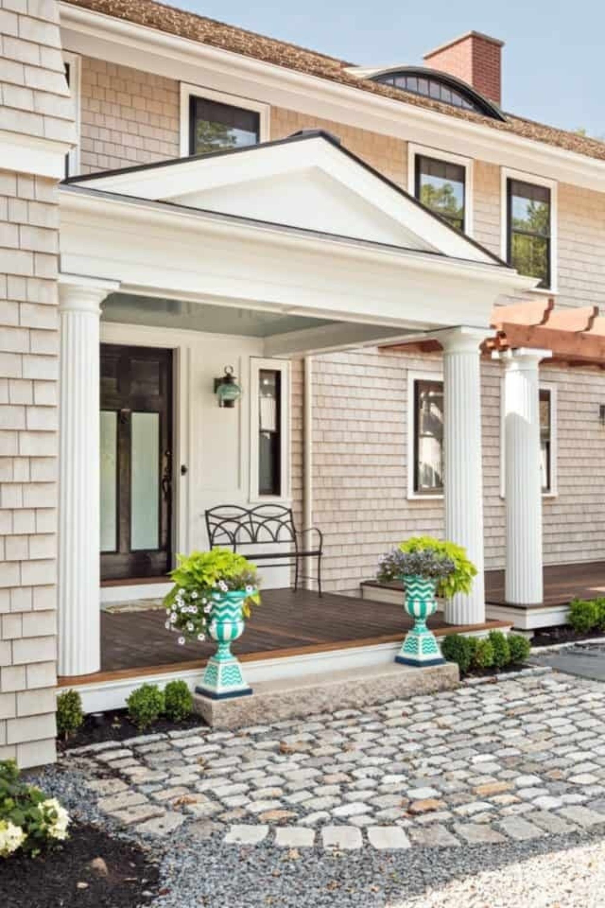 The house has a cedar taper sawn shingle roof fastened with stainless steel nails over building paper and cedar breather. The house has all new pre-stained white cedar shingles. All the exterior trim has been replaced. We built on the front entry way using reclaimed columns. We also added the pergolas on the front and rear of the house. The new Carriage House-garage and Porte-cochere have also been added to the main house by our company.